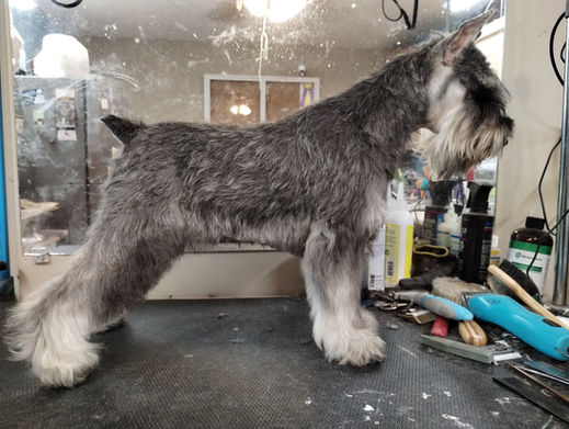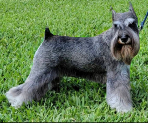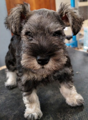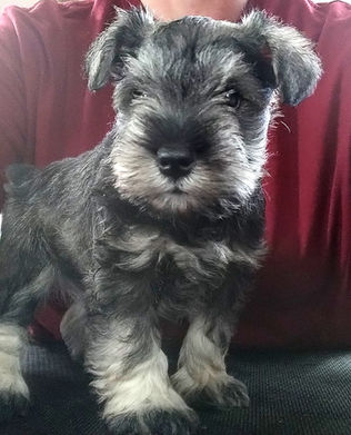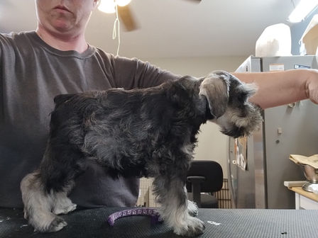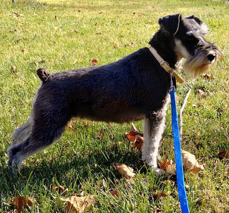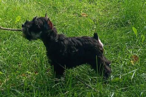 FYI - All Schnauzers are born with tails. Historically, tails and ears were cut short (docked and cropped) in order to give the rats and other vermin they hunted less areas to bite and do damage to the dog. Today, the breed standard still calls for tails to be docked and ear cropping is optional. Tail docking is to be performed within the first few days of birth. Similar to circumcising a baby boy, the puppy will not be traumatized and has no recollection of it. Since Ophelia was not docked early, she will be keeping her full tail. She is very sweet and personable with people and can be a bossy peacekeeper out in the yard with the other dogs. She definitely won't put up with any BS. She's not as eager to run up to strangers as most of my dogs and prefers quiet energy in her space. I have kept her daughter, Jiggle, to move forward with this line.